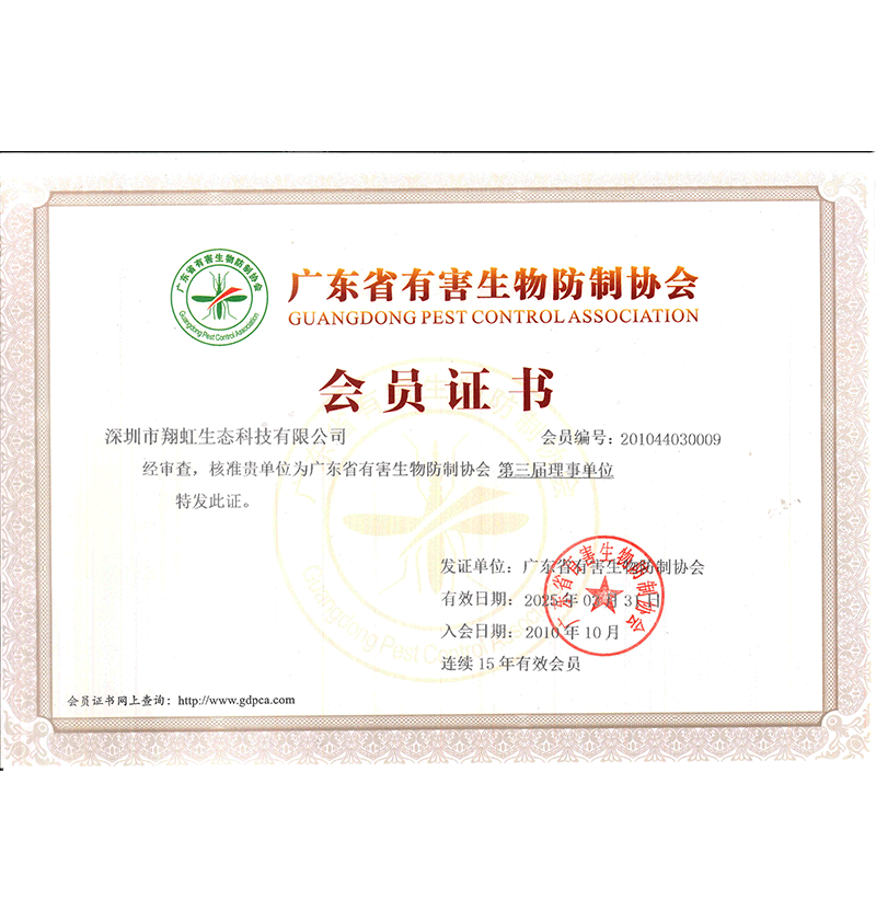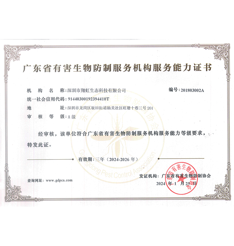 深圳市翔虹生態(tài)科技有限公司成立于1995年,是深圳最早成立的專業(yè)蟲害防治公司之一。公司發(fā)展至今獲得全國有害生物防制服務A級資質(zhì)、廣東省有害生物防制服務A級資質(zhì)、深圳市有害生物防制服務A級資質(zhì)、廣東省有害生物防制服務A級資質(zhì)、深圳市有害生物防制服務甲級資質(zhì)的單位,是中國有害生物防治協(xié)會會員、廣東省有害生物防治協(xié)會會員、深圳市有害生物防治協(xié)會理事單位,多次獲得“深圳市十佳消殺單位”榮譽。